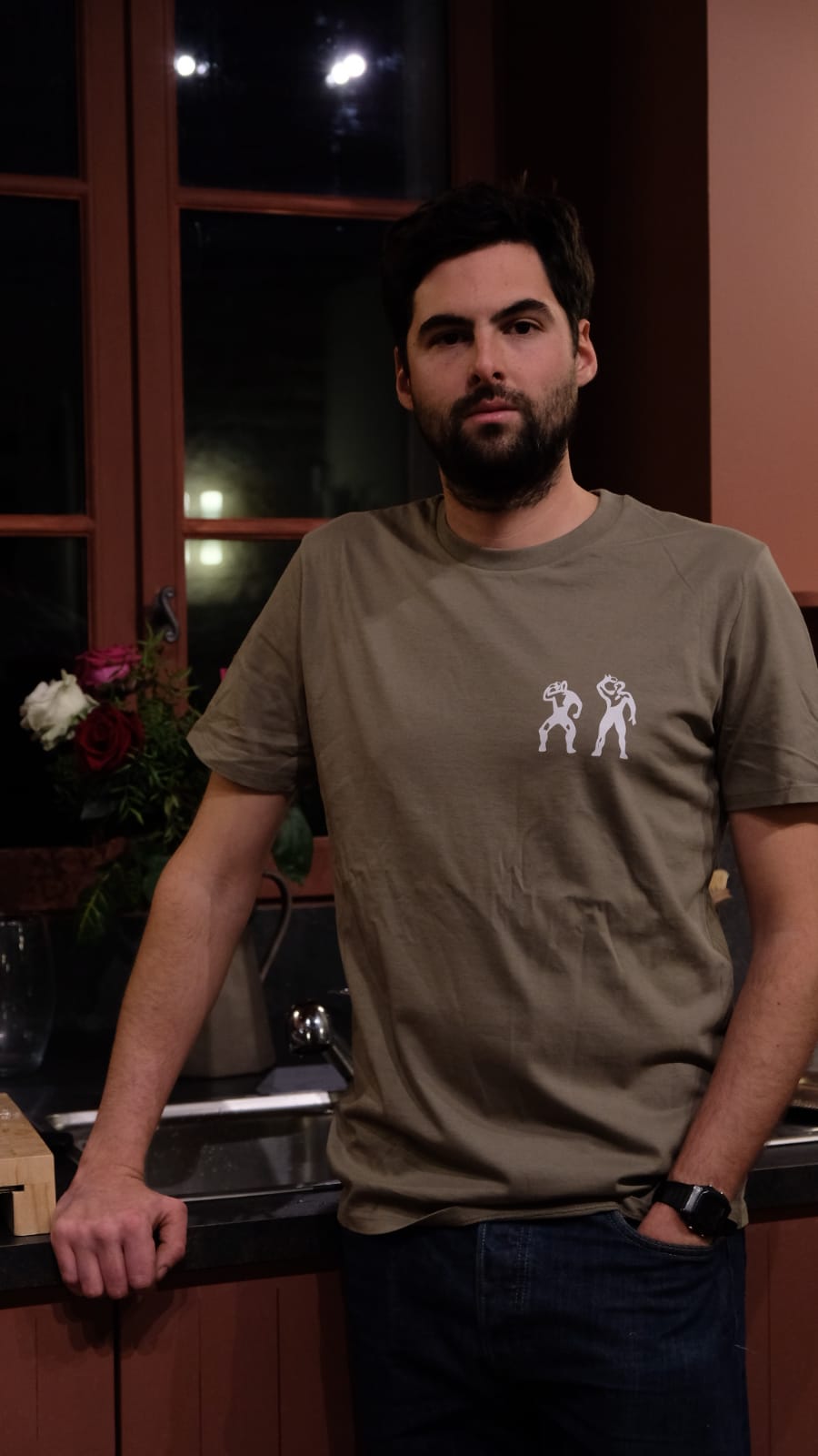 Célébrez Epaulé Jeté - illustration originale de Michel Tolmer - avec un t-shirt kaki.